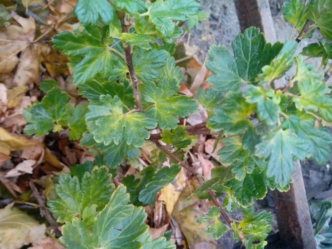 Молодые побеги не толстые, быстрорастущие, почти не имеют шипов, с укороченными междоузлиями, хорошо разветвлённые. Из-за этого кусты часто страдают от излишней загущенности. Листья привычного размера, с пятью лопастями, зелёные с глянцем.