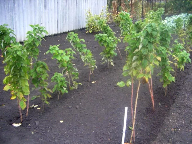 Весной малину сажают как можно раньше. Для удобства перед посадкой размечают будущие ряды. В отличие от обычных штамбовые сорта малины можно высаживать чаще.