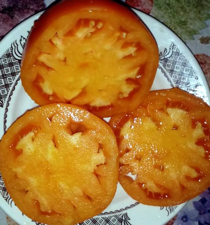 Плоды красивые, насыщенного жёлто-оранжевого цвета, крупные, мясистые, ароматные, округлой формы. Могут быть ребристыми. В разрезе мякоть в меру плотная с небольшими 6-8 семенными пазухами. Семян не много. Размер небольшой. Кожица глянцевая. Не подвержена растрескиванию.