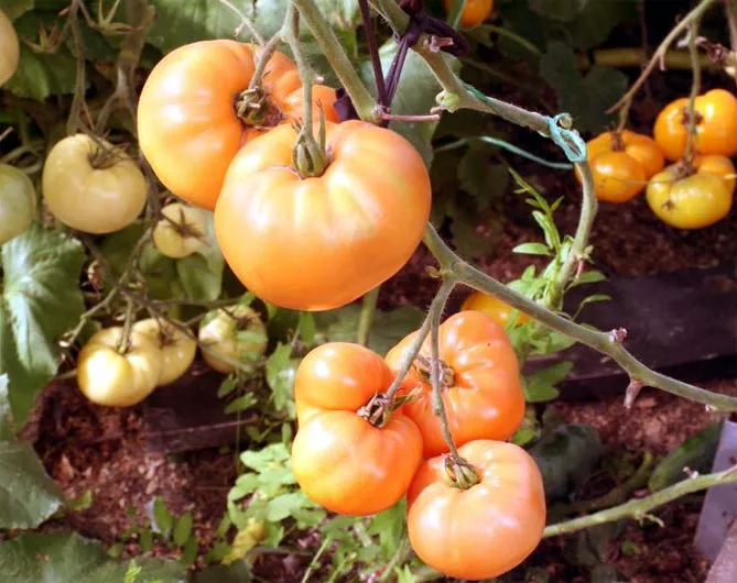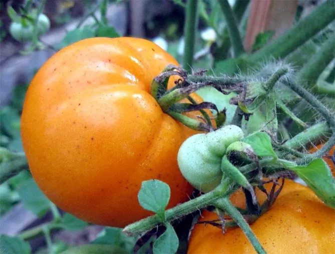 Если на жёлто-оранжевом томате присутствует зелёное пятно возле плодоножки, значит, он созрел не полностью. При необходимости помидоры снимают с куста и оставляют дозревать в тёмном месте.