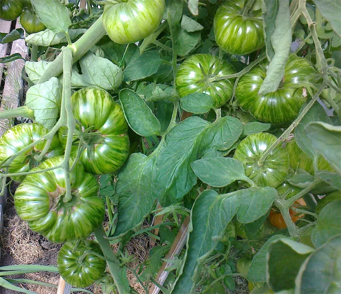 Выращивала эти помидоры в прошлом году. Куст вырос высокий, мощный, до потолка теплицы. Помидорки очень милые, полосатые, коричнево-зеленые. Понравились, вкусные!