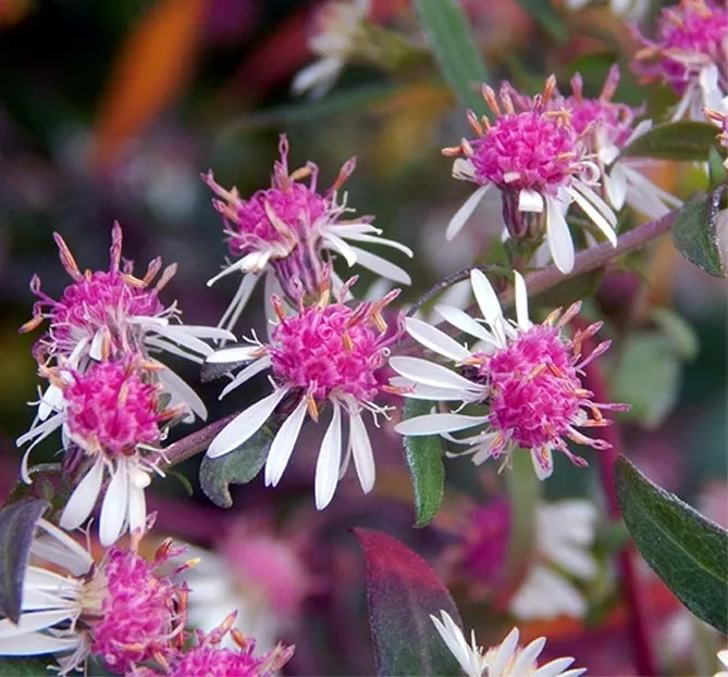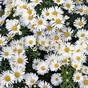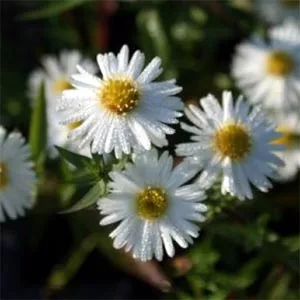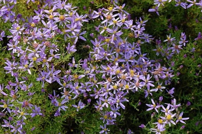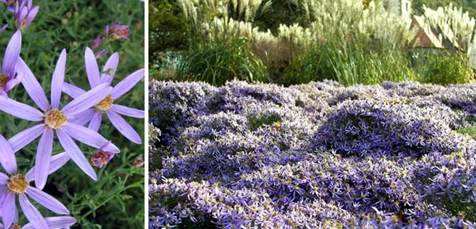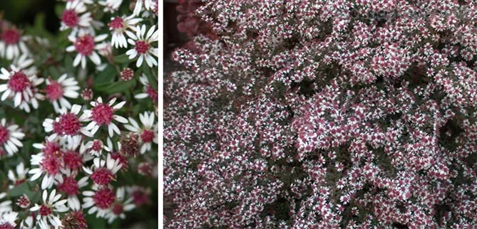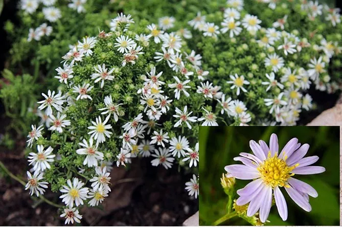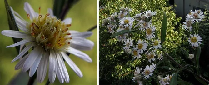 Привлекательную листву имеют многолетние вересковые сорта (Aster ericoides). У этого вида сильно разветвленные побеги и листья узкие, как иглы. Цветет в октябре, покрываясь множеством маленьких белых цветов, украшает сад до мороза.