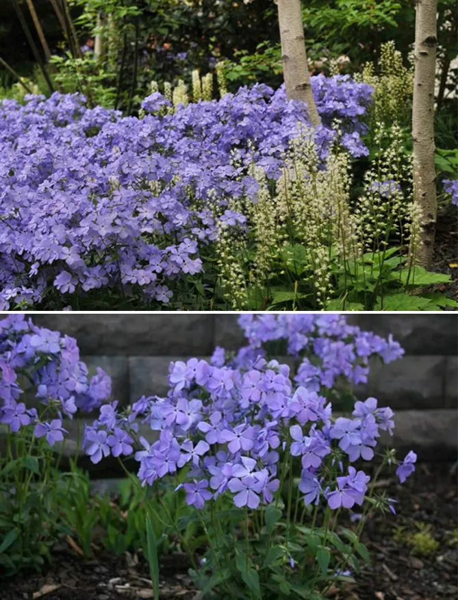 - Флокс ползучий «Блю ридж» Blue Ridge – отличный сорт многолетнего флокса для создания живописных голубых невысоких ковров. Он образует плотные и компактные кустики высотой около 15-20 см. Это надежное растение для альпинариев, тенистых цветников и лесных садов. Идеально подходит для использования в качестве дернового растения, создает красочные ковры. Используется для затененных частей рокариев, на клумбах, под деревьями.
