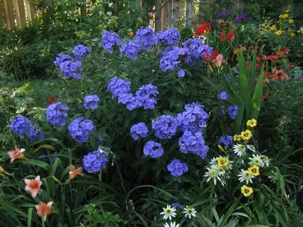 - Сорт голубых флоксов «Голубой рай» Blue Paradise. Интересный, достаточно высокий (80-100 см) сорт с голубыми цветками с пурпурным оттенком. Метельчатые ароматные соцветия появляются с июля по сентябрь. Окраска лепестков варьируется в зависимости от количества света и влажности воздуха. В солнечный полдень соцветия переливаются оттенками пурпурного, утром и вечером, когда меньше солнца, приобретают чудесный насыщенный голубой тон.