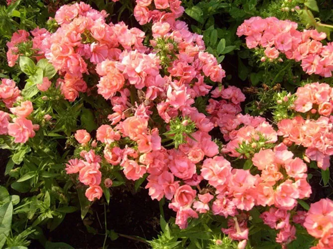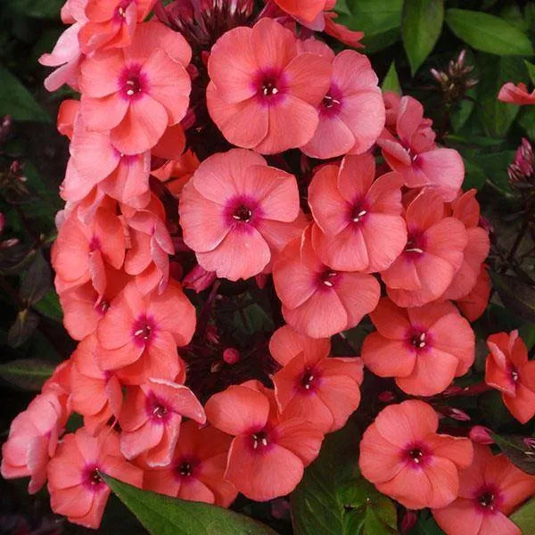 - «Коралл» Coral – миниатюрный карликовый сорт флокса из серии «Flame», отличающийся красивой коралловой окраской крупных соцветий. Достигает небольших размеров (до 30 см). Создает кустистые растения с пышными соцветиями. Цветет долго, обильно.