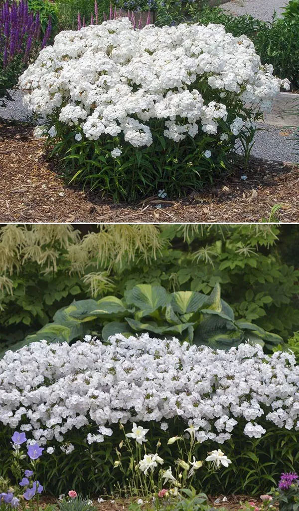 Отдельно стоит выделить сорта Phlox paniculata с махровыми цветами. Например, сорт «Тиара» – компактное растение, отличающееся прекрасными густыми пышными соцветиями элегантного кремово-белого цвета. Махровые цветы этого флокса состоят из нескольких слоев перекрывающихся лепестков и выглядят как крошечные розочки. Период цветения: июль-август. Растение вырастает примерно до 50 см.