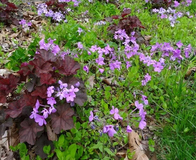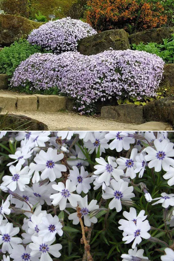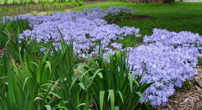 Отличное многолетнее почвопокровное растение – Phlox stolonifera – флокс столоносный или ползучий. С апреля по июнь облако голубо-сиреневых, сильно ароматных цветов поднимается над подушками из плотных лопаточных листьев. Они растут на длинных стеблях, пятилопастные, одинарные с контрастными оранжевыми тычинками. Цветки такие же крупные, как у метельчатых флоксов. Дополнительное преимущество растения – вечнозеленые листья, благодаря которым клумба не пустует в межсезонье.