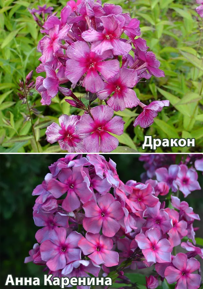 - «Наташа» – сорт пятнистого флокса с двухцветными цветками. Цветет с июня по август, образуя длинные цилиндрические куполообразные метелки из бело-малиново-розовых цветов. Вырастает до 60-90 см.