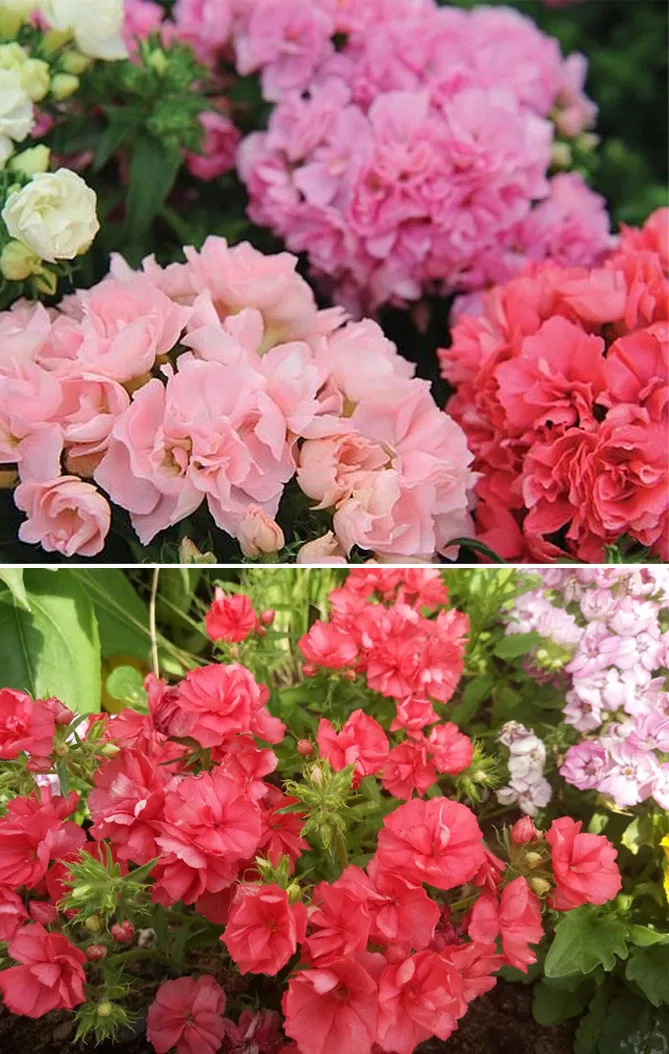 Сорт «Промис» имеет махровые цветки диаметром около 3 сантиметров розового, белого, оранжевого, сиреневого окраса. Цветет с июня и до октября.