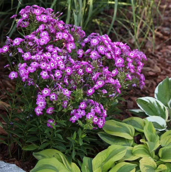 - «Далила» Delilah – компактный сорт фиолетового флокса с пурпурным оттенком, достигает 50-60 см, ширина примерно 30-45 см. Фиолетово-розовые, густо собранные цветы красиво смотрятся на фоне зеленых удлиненных листьев. Красивые соцветия украшают сад с июля по сентябрь, имеют приятный сладкий аромат.