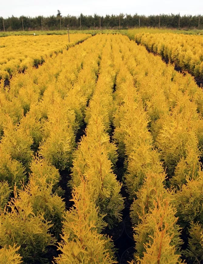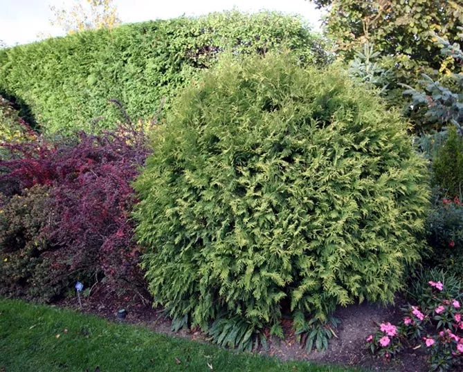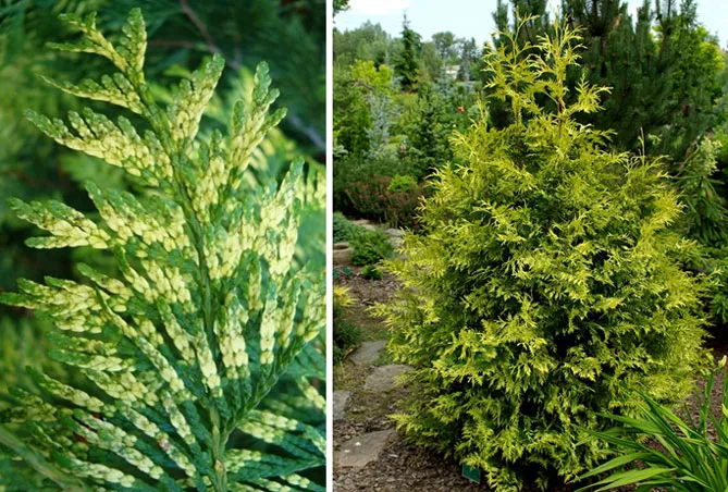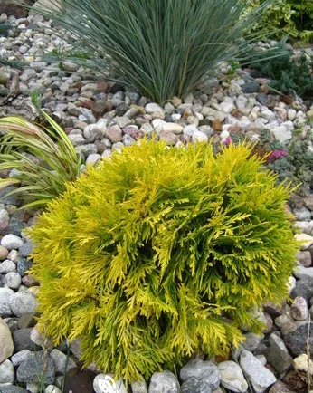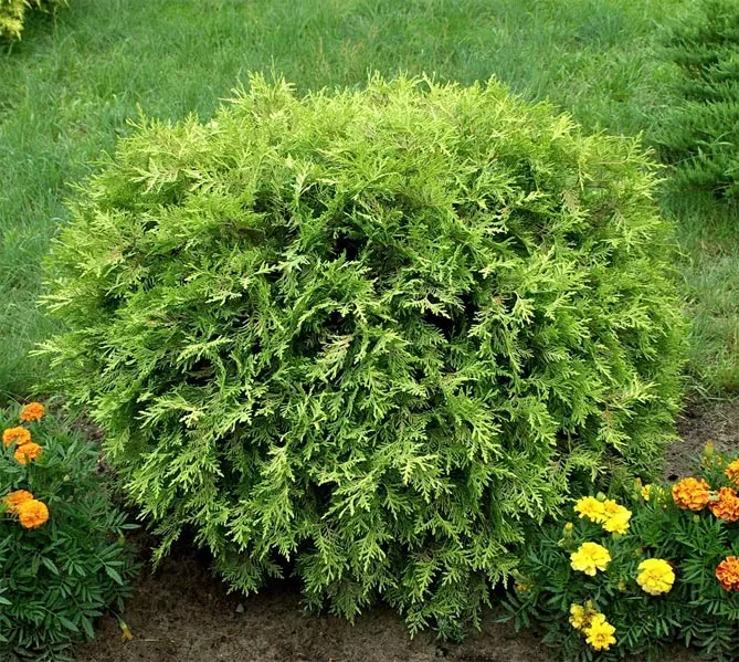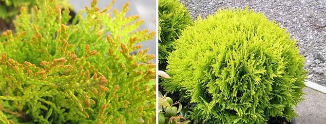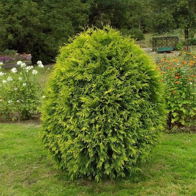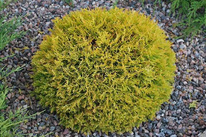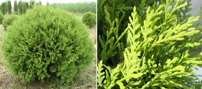Золотой глобус – популярный сорт из Канады, характеризуется медленным ростом и уникальным стилем, цветом. Сорт создает восхитительный шар с блестящими золотисто-зелеными побегами.