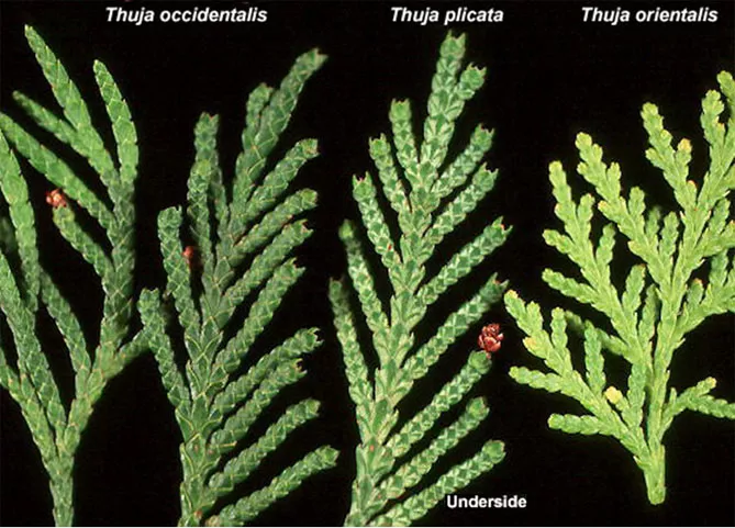 Род Туя (Thuja) принадлежит к семейству кипарисовых (Cupressaceae), включает 5 видов: