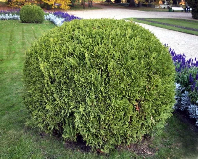 Широкая, шаровидная западная туя Глобоза светло-зеленого цвета идеально подходит для садовых живых изгородей. Это популярный зеленый довольно большой шаровидный кустарник с небольшими требованиями. Туя Глобоза умеренно растет – в возрасте 10 лет достигает ширины и высоты около 1 м. Старые растения завязывают шишки и теряют часть внешнего вида, поэтому их стоит обрезать, тогда куст вырастает до высоты 1,5 м.