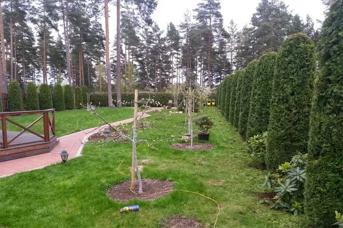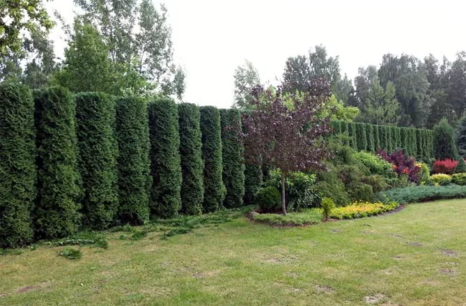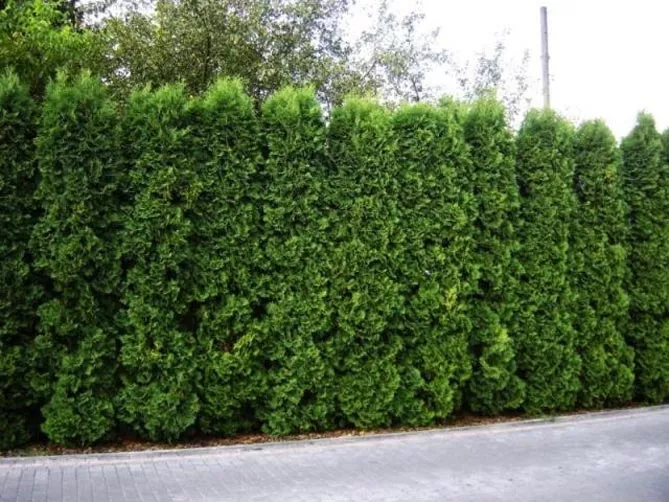 Следует помнить: быстрорастущие сорта туи могут достигать большой высоты кроны – через несколько лет их придется обрезать. В противном случае растения могут быстро подняться по забору и стать высокими деревьями (даже более 10 м). Обрезка заставит растения хорошо расти и сформировать зеленую стену.
