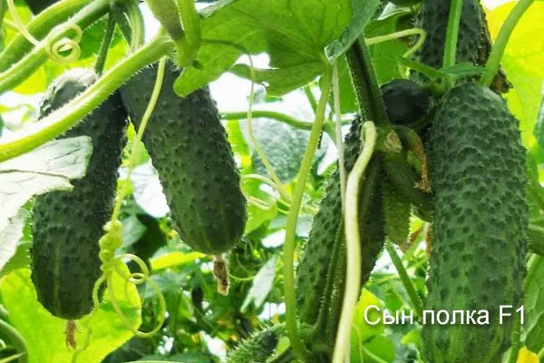 - Сын полка F1. Сажают корнишон только в почву (открытый грунт). Сорт будет стабильно плодоносить в течение всего сезона. Огурчики отличаются светлым цветом кожуры, на поверхности которой имеются бугорочки. На 45 день после высадки начинается плодоношение.