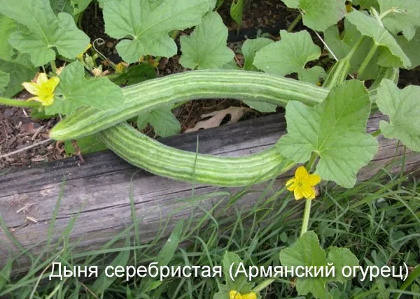 - Дыня серебристая. Имеет большие размеры и неприхотлива в уходе. Семена для открытого грунта необходимо предварительно замачивать. Кожица данного огурца не будет горчить, а мякоть напоминает вкус дыни. Опытные хозяйки из данного сорта варят варенье.