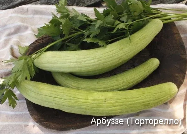 - Арбуззе (Торторелло). Интересный сорт огурцов, которые обладают привкусом дыни. Растение завезено из Италии. Плоды бледно-зеленые и в длину достигают до 40 см. Подойдет для приготовления изысканных блюд.