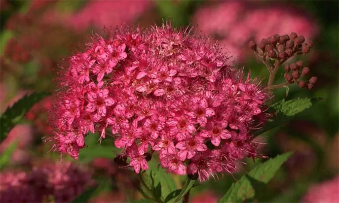 Главная особенность японской спиреи – красивая, плотная и компактная крона. В домашнем садоводстве кустарник редко достигает высоты более 1 метра. Ветви покрыты крупными яйцевидными листьями. Во второй половине лета появляются крошечные, в основном белые или розовые цветки. После выцветания цветки дают семена.
