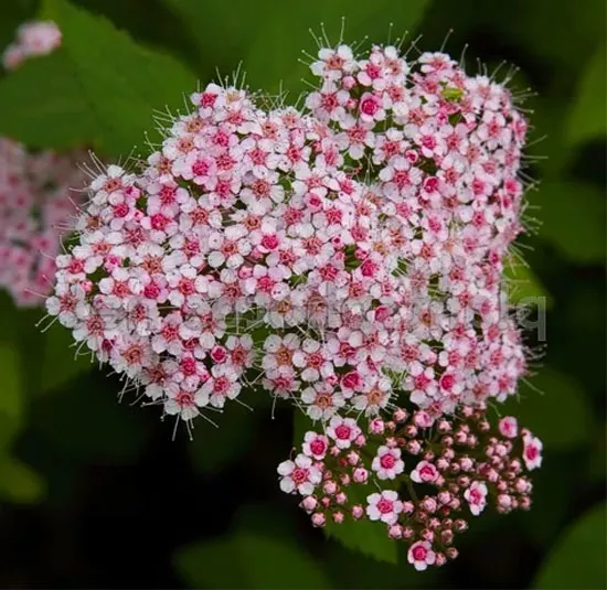 Японский вид спиреи цветет очень долго и обильно (с июня по сентябрь) и имеет цветки бледно-розового или темно-розового оттенка. Цветы появляются на верхушках однолетних побегов и собраны в довольно крупные и плоские соцветия.