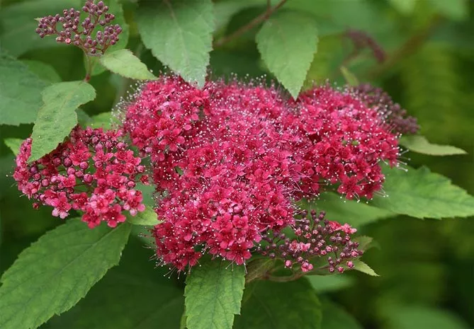 Spiraea densiflora (Спирея густоцветковая) – довольно низкий кустарник, вырастающий до 60 см в высоту. У растения причудливо изогнутые побеги красно-коричневого цвета и темно-зеленые, морщинистые листья, осенью меняющие цвет на оранжево-желтый. Куст выглядит наиболее красиво в июне-июле, когда появляются темно-розовые цветки, собранные в плотные зонтики, размещенные на верхушках побегов. Густоцветковая спирея устойчива к засухе, выращивается даже в прохладных регионах нашей страны, потому что не чувствительна к морозу. Эти кустарники идеально подходят для низких, необрезных живых изгородей.