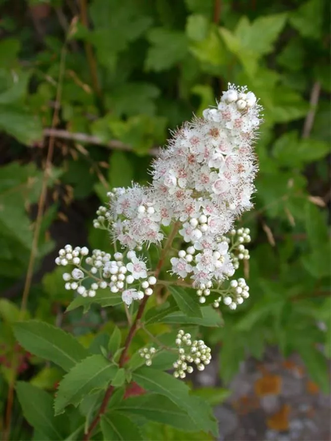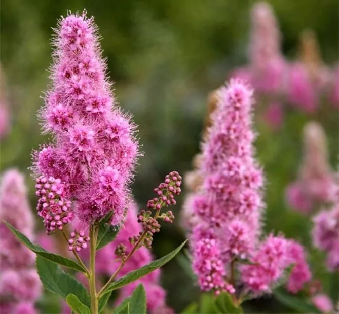 Spiraea salicifolia – Спирея иволистная обычно цветет в июне-июле. Ее можно найти в диком состоянии на влажных лугах и на сухих почвах. Вид очень неприхотлив, переносит практически все условия. Побеги жесткие, куст образует подземные столоны, благодаря которым растение быстро размножается. Высота: до 2 метров. Цветки, как правило, розовые, но встречаются и белые.