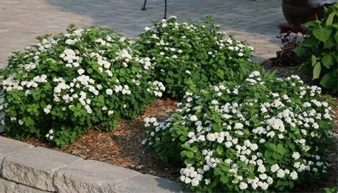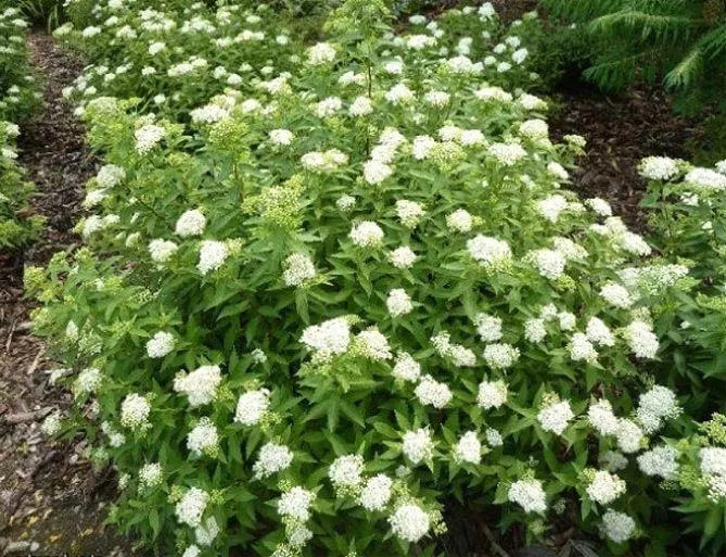 | «Пигмеа Альба» (Pygmaea Alba). Кустарник со сплюснутой сферической формой. Листья светло-зеленые. Белые цветы появляются в конце побегов этого года в июне-июле. | ![]() |