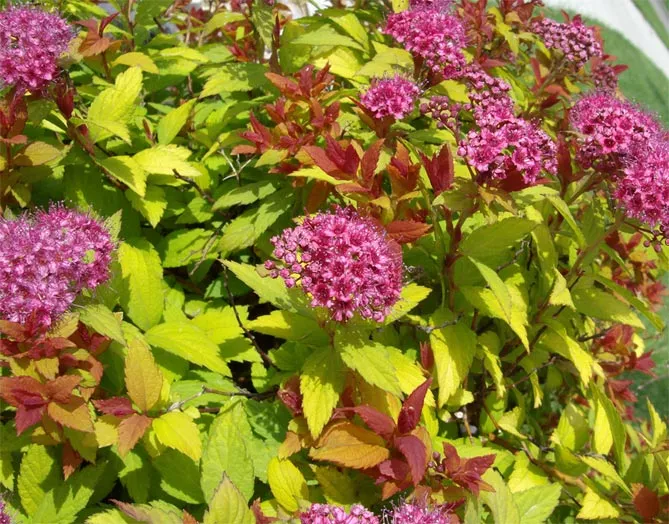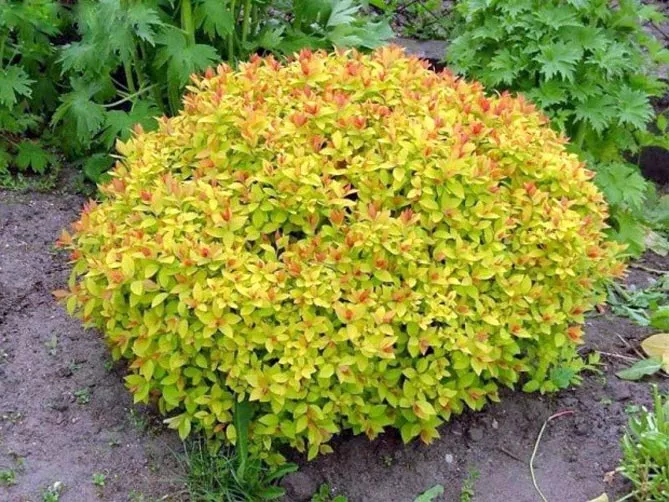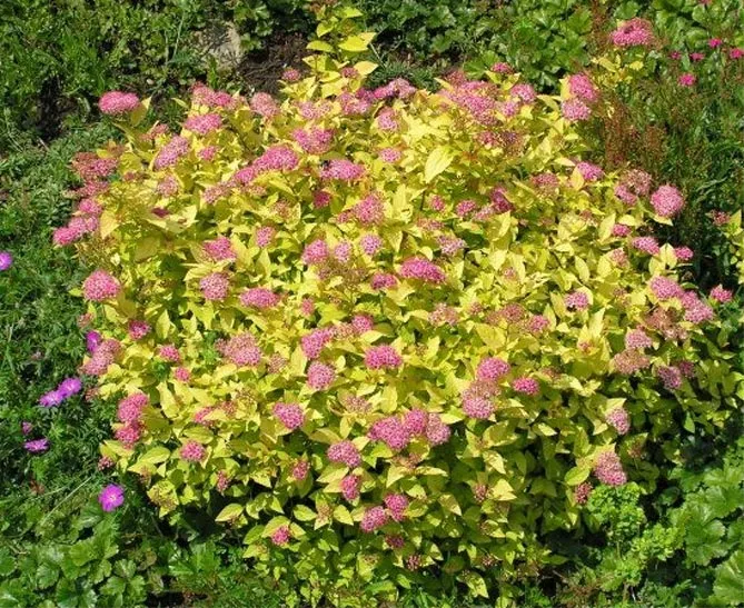 | «Голдмунд» (Goldmound) – золотые листья, цветы розовые, высота куста – до 60 см. | ![]() |