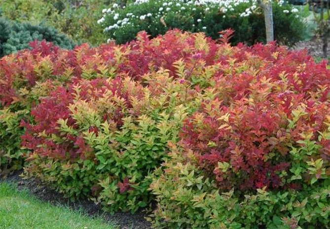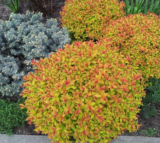 | «Золотое пламя» (Goldflame) – густой и компактный, медленно растущий кустарник. Высота побегов – 80 см. Куст имеет декоративные побеги, листья весной желто-оранжевые, летом – золотисто-желтые или зелено-желтые, осенью приобретают теплые медно-оранжевые тона. Цветы сорта собраны в мелкие соцветия красно-розового цвета. | ![]() |
