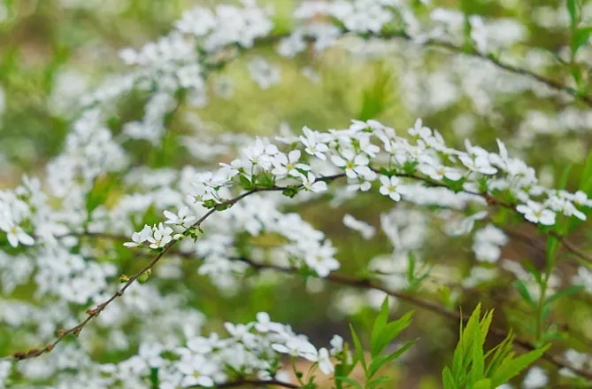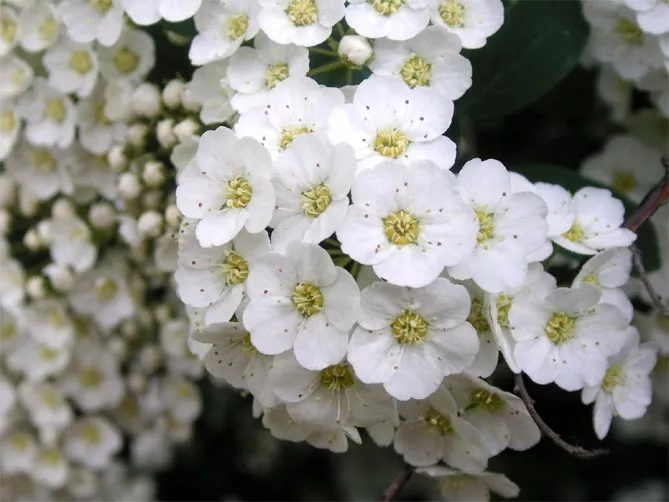 - Раннего срока цветения (апрель-июнь) – у них на прошлогодних побегах появляются цветы, собранные в маленькие белые зонтики.