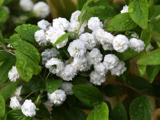 Spiraea prunifolia – спирея сливолистная растет до 2 метров, имеет тонкие изогнутые побеги, покрытые зелеными блестящими листьями. Листья осенью становятся оранжевыми. Цветет в мае-июне белыми цветами. Лучше посадить ее в защищенное место, потому что в суровую зиму она может замерзнуть. До наступления зимы кустарник следует укрыть, поскольку он менее морозостойкий по сравнению с другими видами. Требует солнечного, теплого положения. Рекомендуется для создания кустарниковых комбинаций.