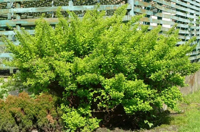 | «Голдмунд» (Goldmound) – декоративный кустарник с желтыми листьями и лилово-розовыми цветками, распускающимися в июле-августе. Листья остаются интенсивно желтыми до поздних осенних месяцев. Сорт образует густые, низкие кустики, высотой до 40 см. | ![]() |