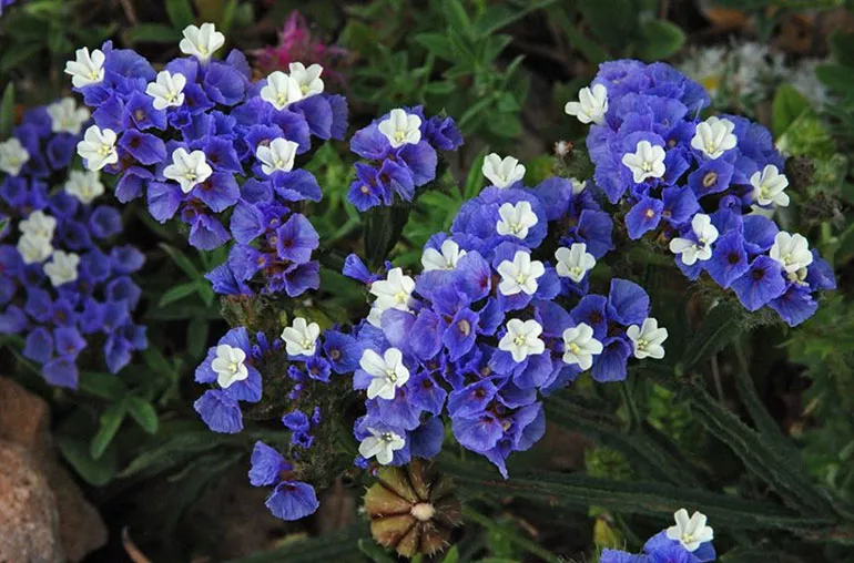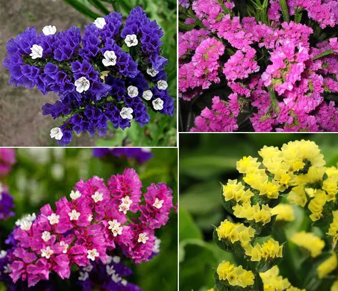 - Цветы – маленькие (4-10 мм), имеют 5 лепестков. Собраны по несколько штук в небольшие колосья на цветоносах. От основания лепестков вырастают 5 тычинок. Цвет самого цветка почти белый, а цвет сухой чашечки определяет декоративную ценность. У разновидностей он бывает темно-синий, белый, в оттенках желтого, розового, карминного, темно-синего.