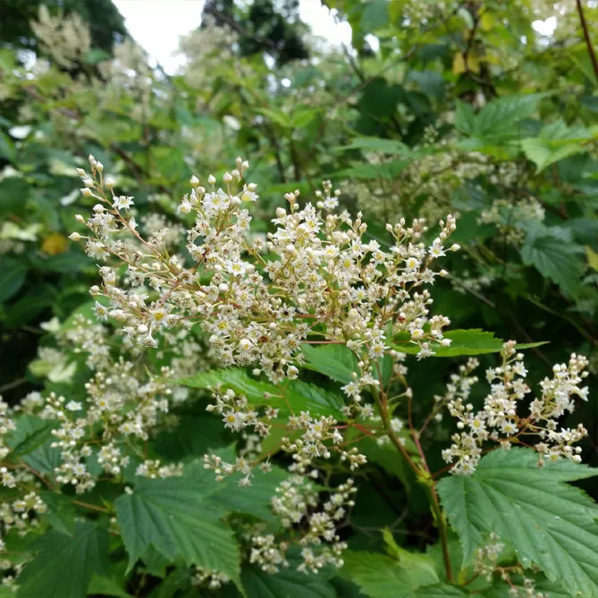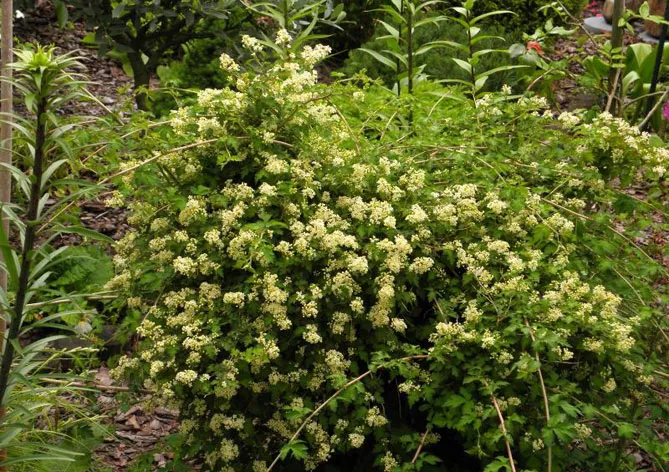 Цветут в июне-июле месяц подряд. Цветы появляются в виде соцветий маленьких белых цветов. Это малоизвестные кустарники, но очень декоративные и неприхотливые, они заслуживают того, чтобы их больше использовали в садах.