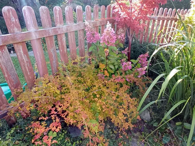 - спирею с розовыми цветами или золотистой листвой;