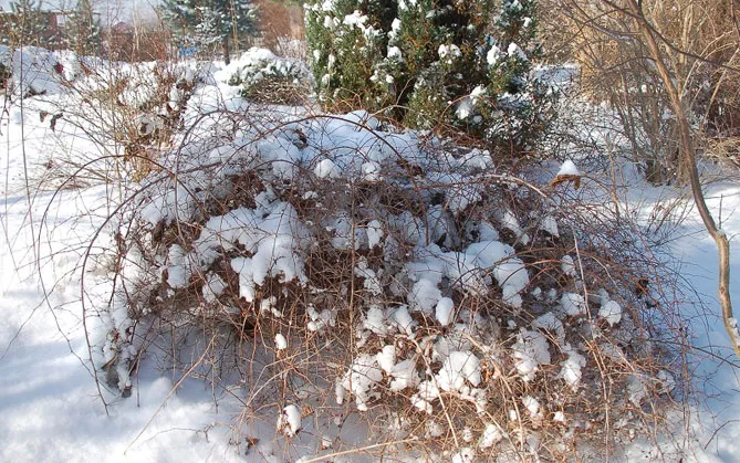 Фото. Зимой на кустарнике декоративно выделяются утолщенные, коричневатые, дугообразные побеги, привлекающие внимание в зимнем саду.