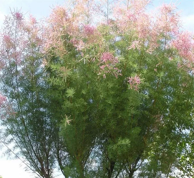 Гребенщик безлистный (лат. Tamarix aphylla) имеет темно-зеленые, узенькие листочки, напоминающие сосновые иглы. В период цветения кончики побегов покрываются светло-розовыми цветками.