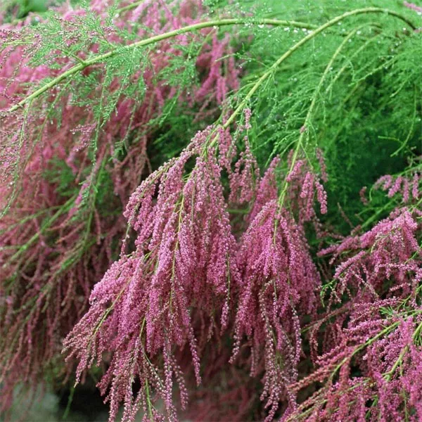 - Tamarix ramosissima Pink Cascade «Пинк каскад» – цветки темно-розовые.