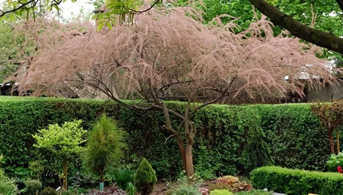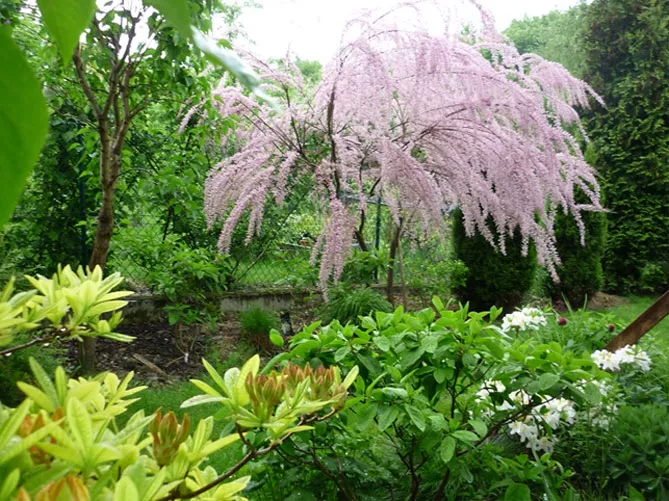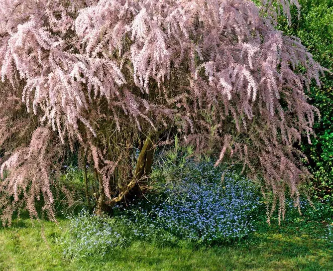 Не стоит сажать тамариксы вместе с кустарниками с крупными цветами и разноцветными листьями, на их фоне тонкая красота тамариксов будет незаметной.