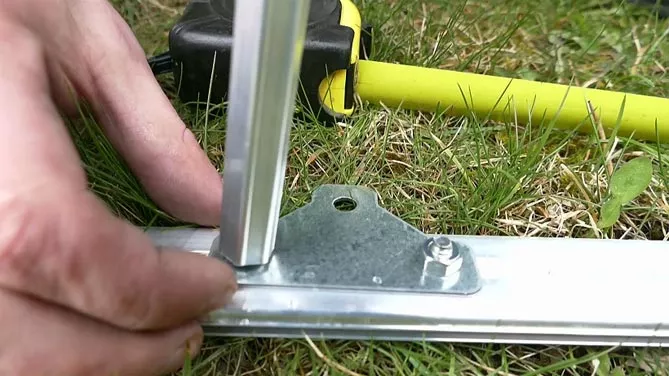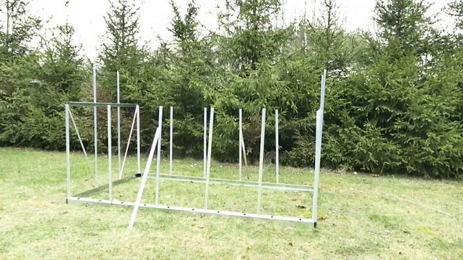 Одним из способов сборки легкой теплицы является рытье ям и встраивание анкеров в бетон. На этом этапе перед заливкой бетона стоит построить нижнюю раму и закрепить на ней анкеры. Благодаря этому, прежде чем заливать якорь бетоном, мы сможем проверить правильность установки теплицы, используя уровень и линейку.
