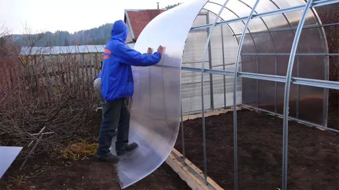 Сотовые панели изготавливают по камерной технологии, они работают как окна в квартире с вакуумом посередине. Использование поликарбоната толщиной 4 мм обеспечивает отличную теплоизоляцию, что особенно важно ранней весной, когда посевы подвергаются воздействию морозов. Поликарбонат очень легкий и прочный, устойчив даже к граду. Использование поликарбонатных панелей имеет также существенное преимущество перед конструкциями на основе стекла, в виде защиты от ультрафиолетового излучения. Ультрафиолетовое излучение негативно влияет не только на кожу человека, но и на посевы. Сотовый поликарбонат удерживает 100% УФ-излучения.