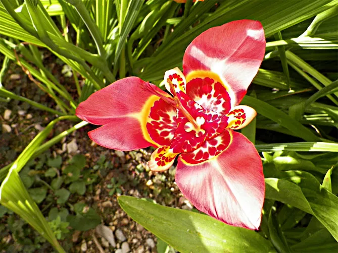 Цветок тигридия разноцветный и очень оригинальный. Благодаря интересному рисунку лепестков, наибольшее распространение получил вид – Тигридия павлинья (Tigridia pavonia). Тем, кто любит пестрые цветники и хочет получить действительно интересный, необычный эффект на клумбе, этот цветок подойдет идеально. Растение происходит из Мексики, в Европе выращивается с 16-го века. Tigridia – многолетник, принадлежащий к семейству Ирисовые (Iridaceae).