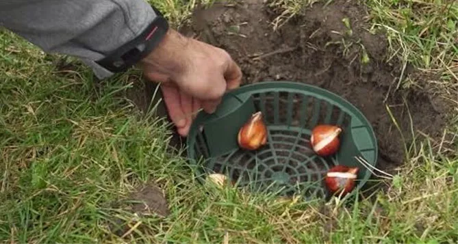 Интересное решение – сажать луковицы в проволочную или пластиковую посадочную корзину, которая защищает луковицы от повреждений мышами. Корзина позволяет легче выкапывать луковицы на зиму.