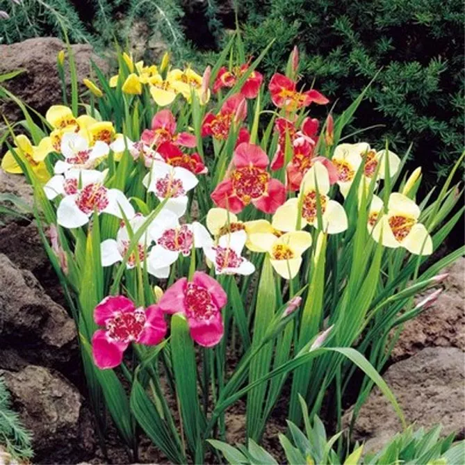 - Тигридия «Микс» – часто встречается в продаже смесь сортов с разной окраской цветов. Несколько цветков разных сортов такой смеси постепенно расцветают с конца июля по сентябрь.
