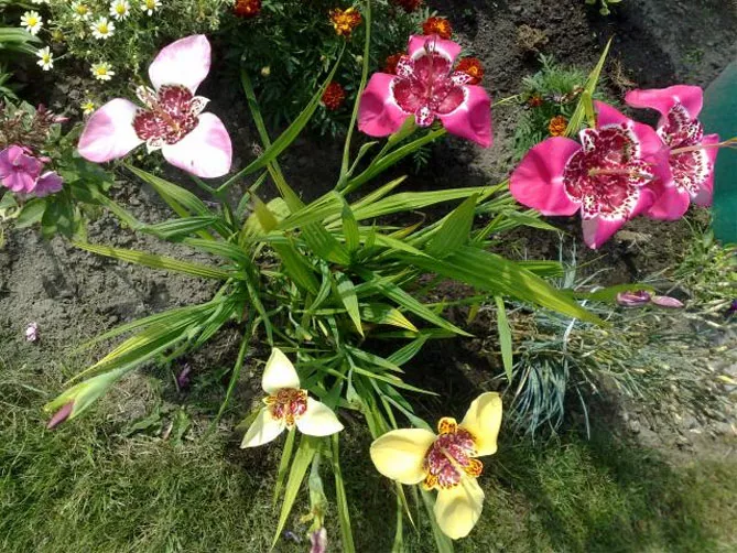 Тигридии красиво выглядят при выращивании среди многолетних растений с темно-красными или серыми листьями. Сорта с красными и желтыми цветками можно посадить рядом с однолетними растениями, цветущими синими цветками – агератум, лобелия.