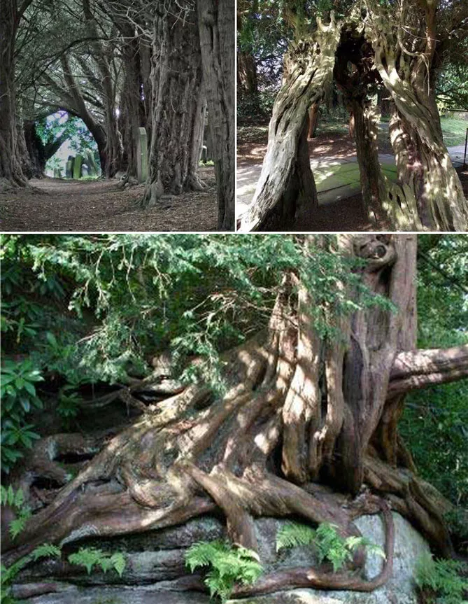 Фото. Тисовая аллея недалеко от Уорлтона, Англия, старый тис с полым стволом и тис, корни которого уходят в скалу
