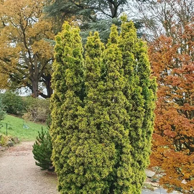 Т. ягодный «Ивори Тауэр» (Taxus baccata Ivory Tower) образует очень узкую, вертикальную колонну, состоящую из декоративной пестрой листвы. Высота в зрелости – 3 м. Летом молодые побеги приобретают желтую окраску, что создает красивый градиент со старой нежно-зеленой листвой.