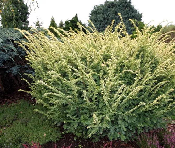 Taxus baccata ‘David’ или тис ягодный «Давид» по описанию и фото имеет красивую золотистую листву, габитус кустовидный. Посадка возможна на солнце и в полутени, морозостойкость (минимальная температура: -15°C). Растение достигает высоты 2 м, ширина в зрелом возрасте – 1 м, окраска цветков малозаметная, окраска листвы пестрая с желтым.