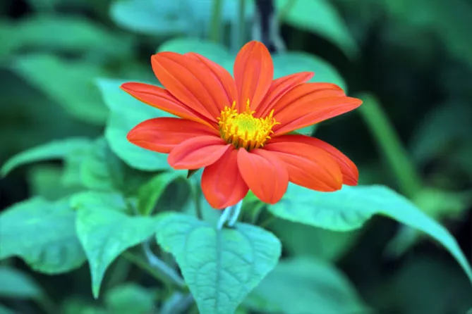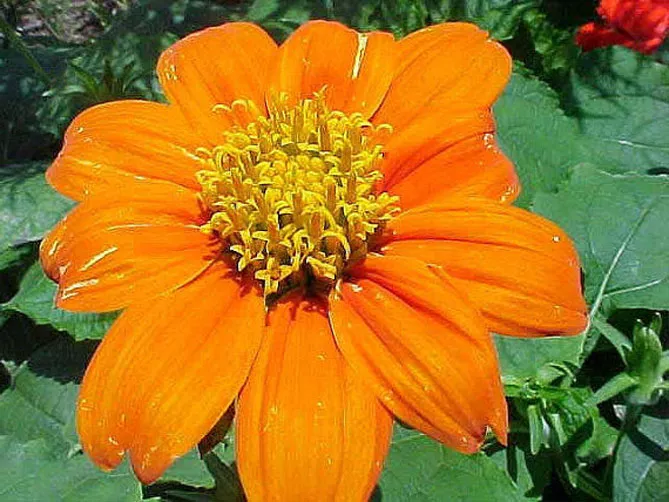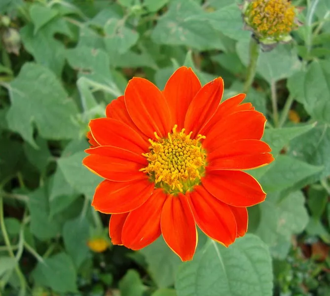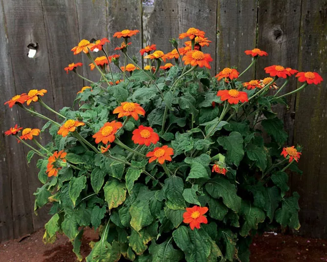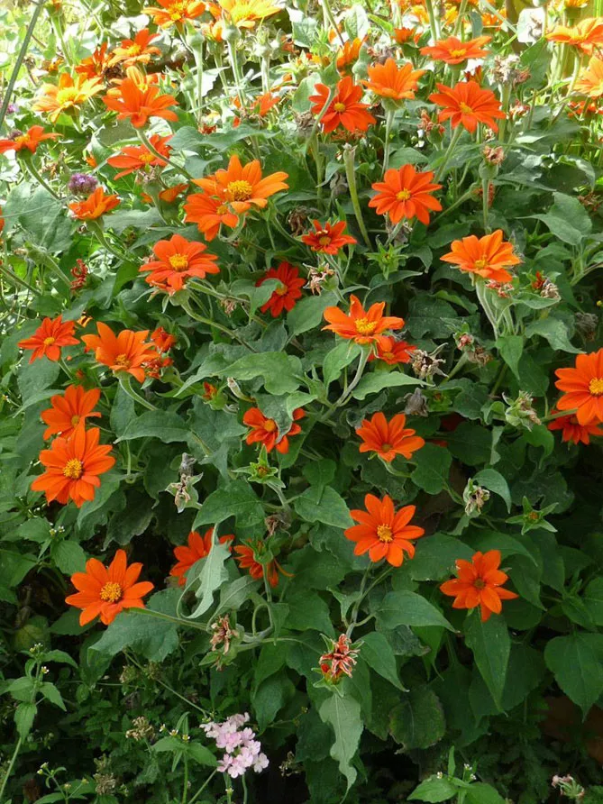 Титония круглолистная – однолетнее растение с прямостоячими, сильно разветвленными побегами. Вырастает до 80-100 см в высоту. Ее крупные, яркие цветы напоминают георгины или подсолнухи.