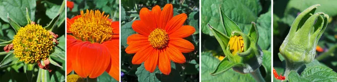 - Цветы. Период цветения титонии: июль – октябрь. Бутоны толстые, опушенные. На верхушке пышных побегов образуются цветочные корзинки (диаметром 6-10 см, до 15см), напоминающие цветки подсолнуха. Количество лепестков варьируется от 8 до 14. Язычковые цветки крупные, оранжевые, они стерильны, их функция заключается в привлечении насекомых-опылителей. Внутренние цветки – многочисленные (100-200 шт.), трубчатые, желтые, длиной около 8 мм с пятью зубцами.