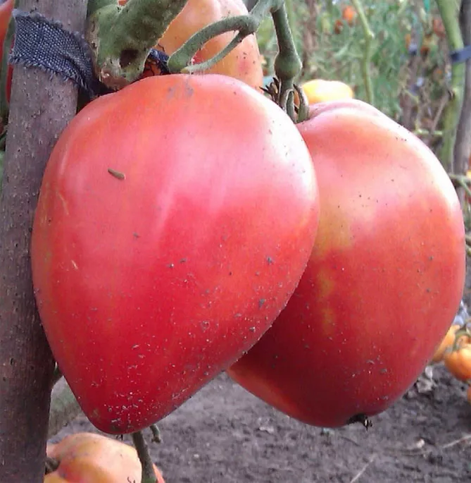 Помидоры сорта Батяня крупные и сладкие. На фото видно, что они имеют сердцевидную форму: книзу плоды сужаются конусом, образуя слегка притупленный «носик». Практически все томаты имеют правильную форму, без уродливых отклонений. Розовая окраска плодов после полного созревания меняется на насыщенный малиновый оттенок.